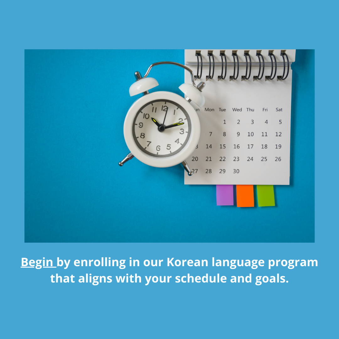 Begin by enrolling in our Korean language program that aligns with your schedule and goals.